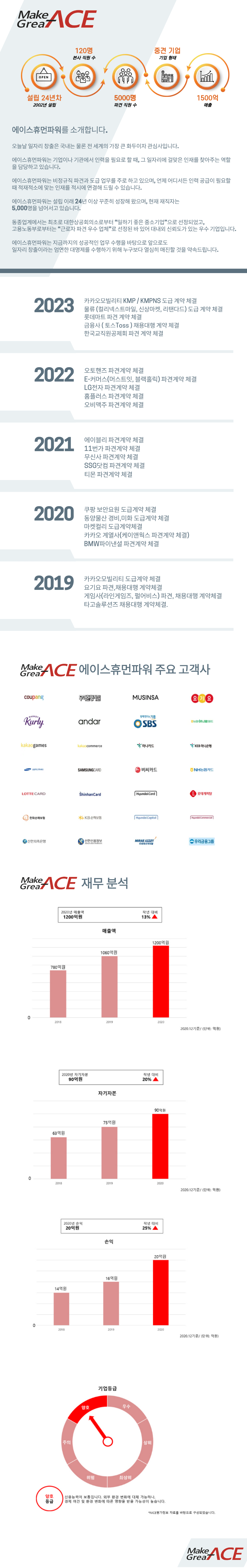에이스휴먼파워(주)는 인재를 소중히 여기는 기업이라는 가치 아래 IT혁명과 함께 빠르게 변화하고 있는 기업의 인력 운용과 고용에 탄력적이고 효율적인 인력 관련 서비스를 제공하고자 2002년에 설립하게 되었습니다. 다양한 직업의 창출과 치열한 기업간 경쟁속에서 사원은 많은 기능들을 익히고 경험을 쌓아 고용을 유지하는 한편, 기업들은 노동제도의 유연성을 강화하여 경쟁력을 더욱 높여야 합니다. 이러한 시장의 변화에 대응하기 위하여 사전교육과 철저한 인재관리를 통하여 우수한 전문인력을 양성, 개발하여 기업의 요구에 적절히 대처함으로써 많은 고용을 창출하여 사회에 이바지하고자 합니다.